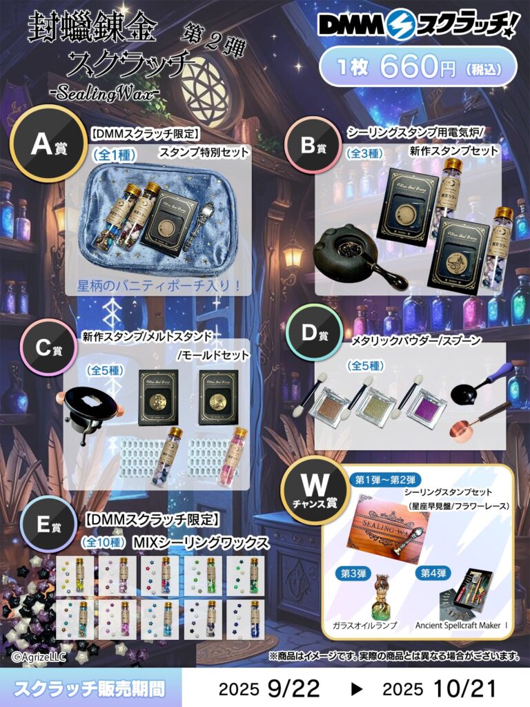 2025年9月22日(月)12:00より、オンラインくじサービス「DMMスクラッチ」にて『封蝋錬金スクラッチ 第二弾 -SealingWax-』を発売いたします。本企画では、DMMスクラッチ限定アイテムを含む全ラインナップをご用意いたしました。ハズレなしで、ここでしか手に入らない封蝋アイテムをお届けします。